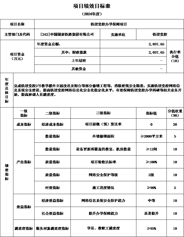 4.预算绩效情况。2024年铁道党校项目支出总额2037.65万元,全部纳入预算绩效目标管理。2024年二级项目“铁道党校办学保障项目”绩效目标表如下: