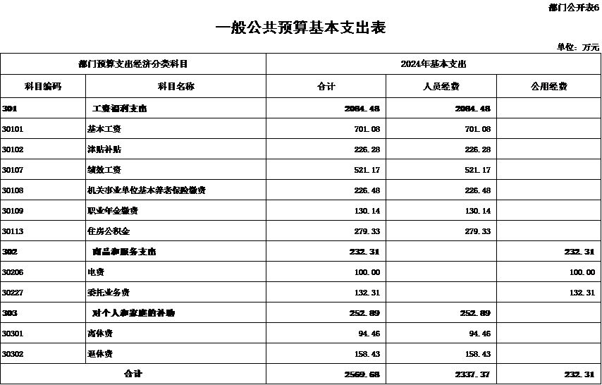 (六)一般公共预算基本支出情况。2024年一般公共预算基本支出2569.68万元,其中:人员经费2337.37万元,日常公用经费232.31万元。