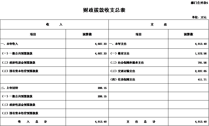 (四)财政拨款收支总体情况。2024年财政拨款收支总预算4813.48万元。收入包括:一般公共预算拨款收入4607.33万元,上年结转206.15万元。支出包括:教育支出1572.56万元,社会保障和就业支出791.56万元,交通运输支出2037.65万元,住房保障支出411.71万元。