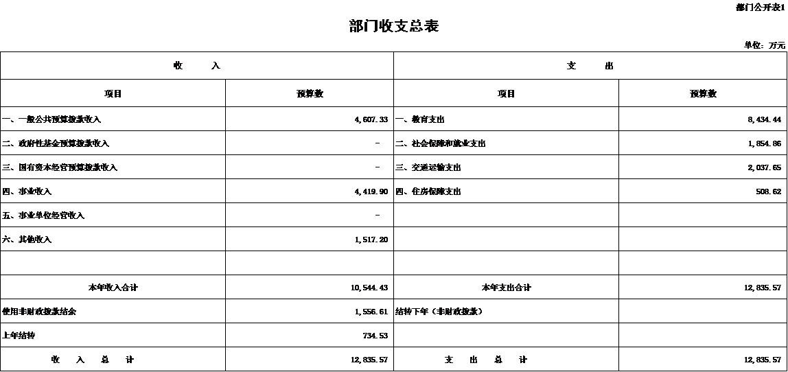 (一)收支总体情况。2024年收支总预算12835.57万元。收入包括:一般公共预算拨款收入4607.33万元,事业收入4419.90万元,其他收入1517.20万元,使用非财政拨款结余1556.61万元,上年结转734.53万元。支出包括:教育支出8434.44万元,社会保障和就业支出1854.86万元,交通运输支出2037.65万元,住房保障支出508.62万元。
