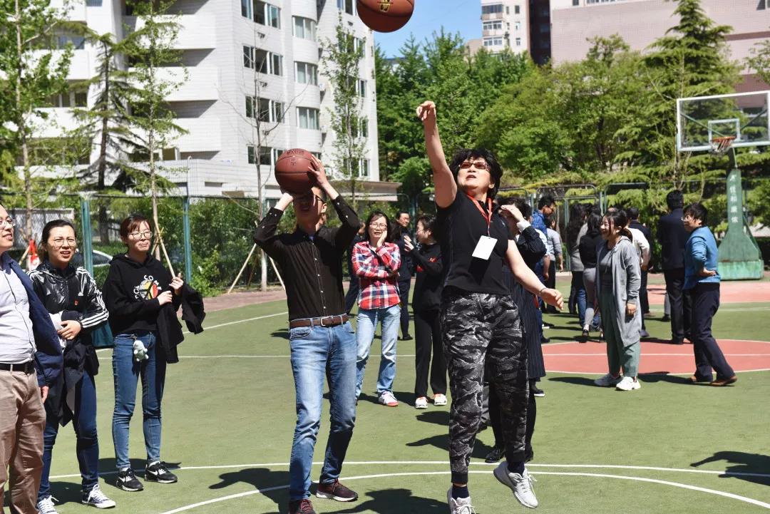 在篮球场上,大家齐心协力、奋力拼搏,投篮比赛在欢声笑语中圆满结束。