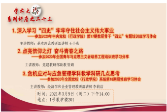 按照学校教学安排,铁道党校于2021年3月9日下午举行第23期学术大讲堂活动。本次活动是围绕参加中央级培训机构专题培训的收获和感想展开,基本理论部讲师王小燕、党建部教师管婧和经济学和企业管理部讲师李莉洁分别作了题为《深入学习“四史”,牢牢守住社会主义伟大事业》《点亮信仰之灯,奋斗青春之路》《危机应对与应急管理学科教学科研几点思考》的交流发言。