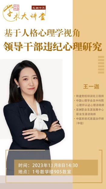期学术大讲堂。由铁道党校培训部王一迦讲授《党员领导干部违纪心理分析