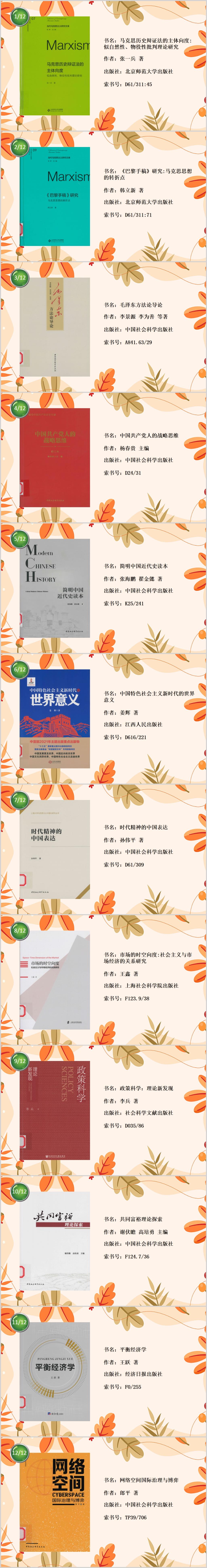 金秋十月,书声琅琅,让我们不忘初心,坚持阅读!图书馆继续为大家好书送上,此次我们精选了马列、政治、哲学、历史、经济、社会等方面的书籍,详见下图。更多精彩好书在图书馆等您抢“鲜”阅读!