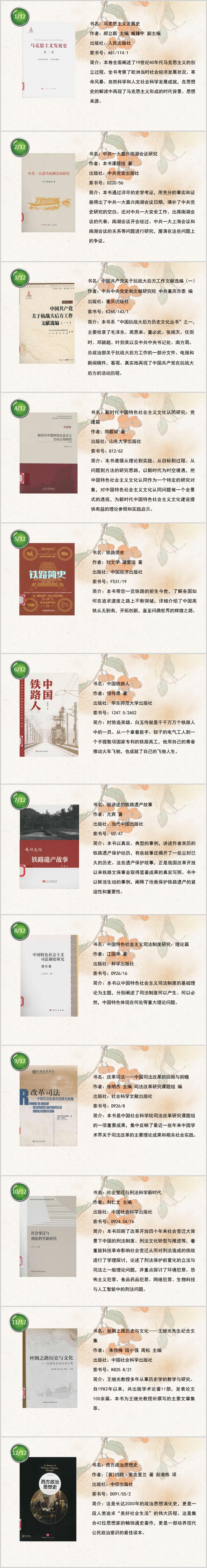 习近平总书记为第四批全国干部学习培训教材作序中提出:“好学才能上进,好学才有本领。中国共产党人依靠学习走到今天,也必然要依靠学习走向未来。”读书学习是加强党性修养、坚定理想信念、提升精神境界的重要途径。多读书读好书,为响应总书记号召,我们精选了马列、党建、铁路、法律、历史和文学等方面的书籍进行推荐,详见图片。
