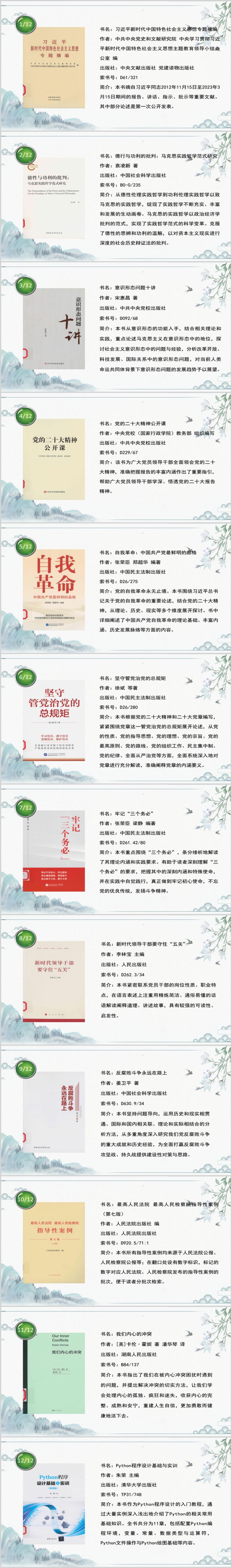 春风十里,不如书香一缕。云端万顷,更胜繁华满树。希望大家在阅读中找到自我、理解生活,本次图书馆结合专业性和可读性,精选了习近午新时代中国特色社会主义思想、党性教育、意识形态、纪检监察、法学、心理学、计算机等相关书籍,欢迎广大教职工前来借阅,详见图片。